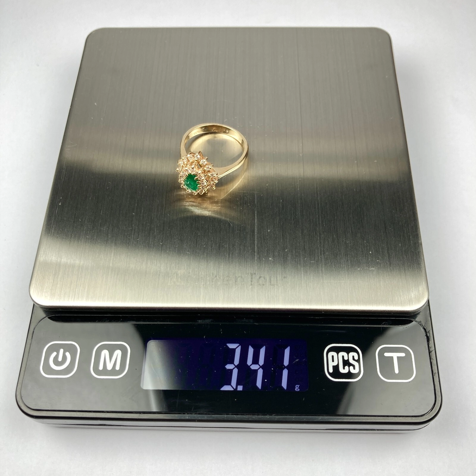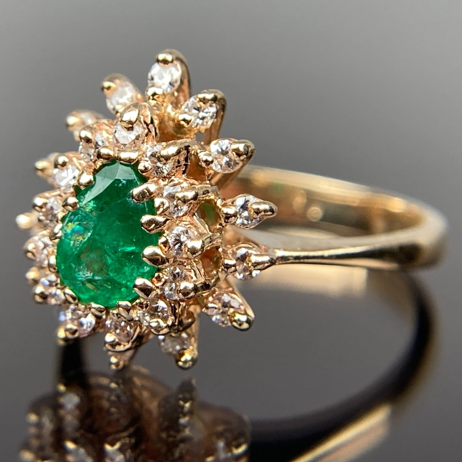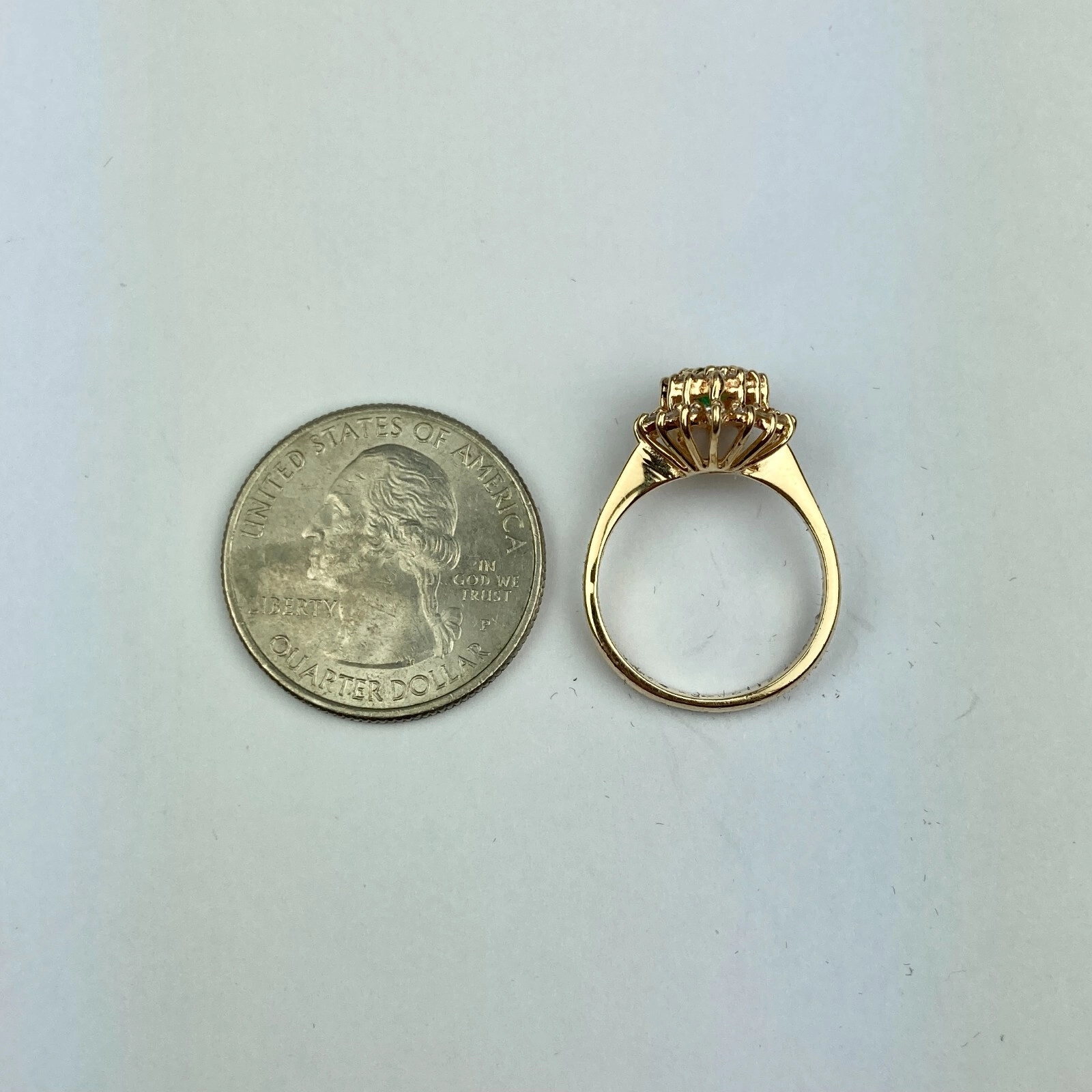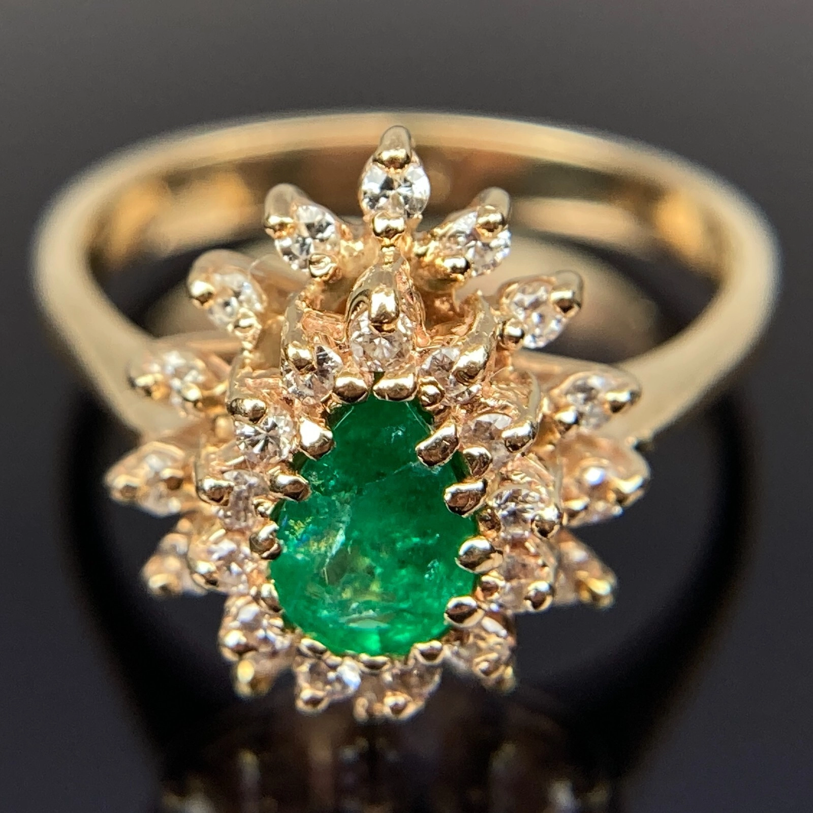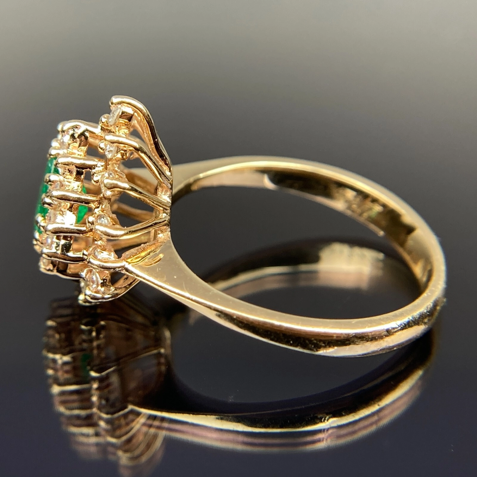 M&M 14k Diamond & Emerald Double Halo Yellow Gold Ring Size 6, 3.41 Grams, Size 6, 0.7 - 0.81 Carats.