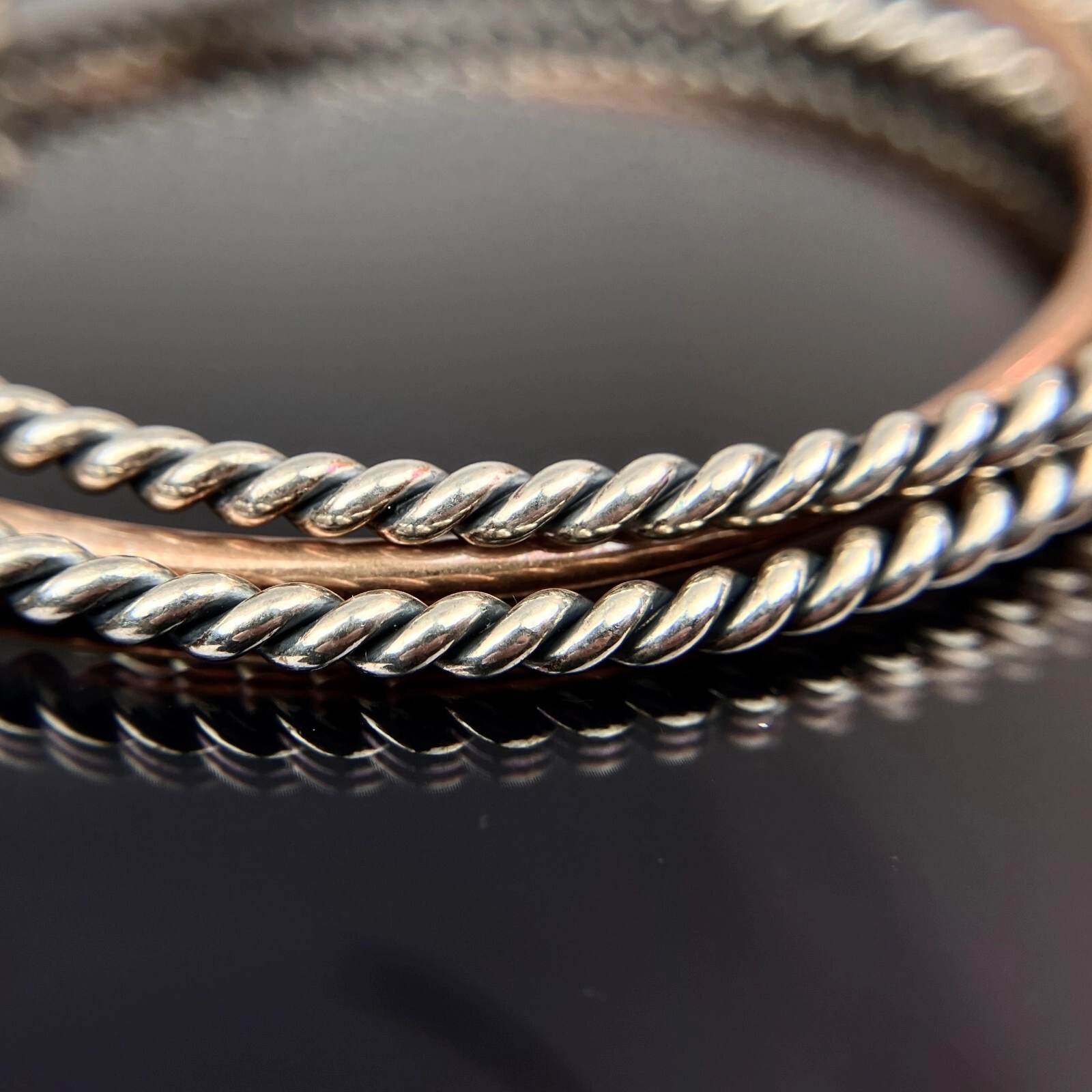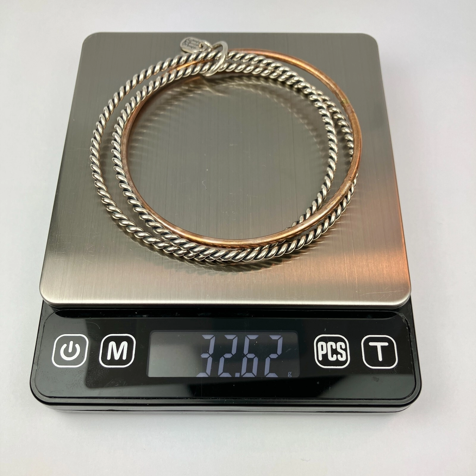 James Avery 925 Sterling Silver & Bronze Braided Cable Triple Stacked Link Bangle, 32.62 Grams, 2.6" Inner Diameter.
