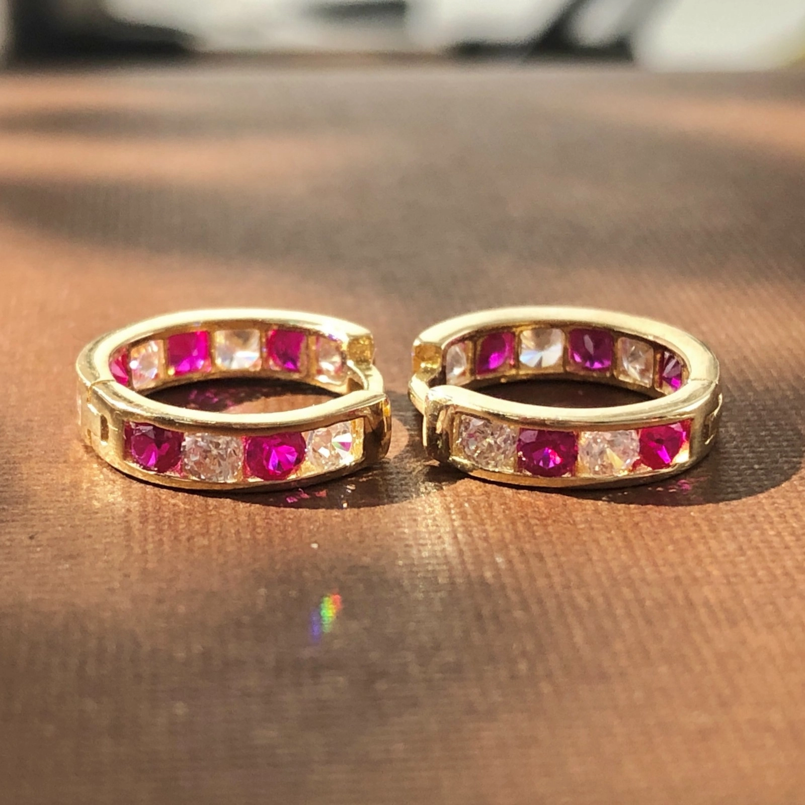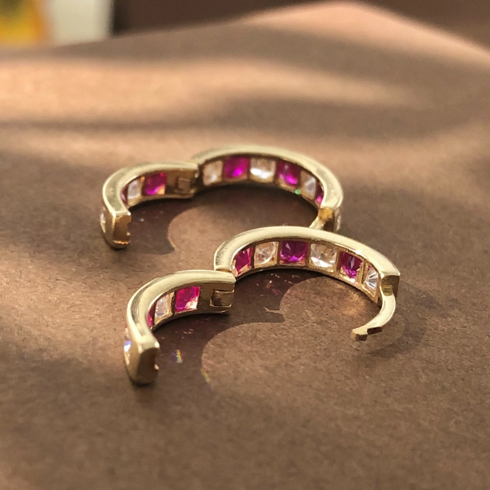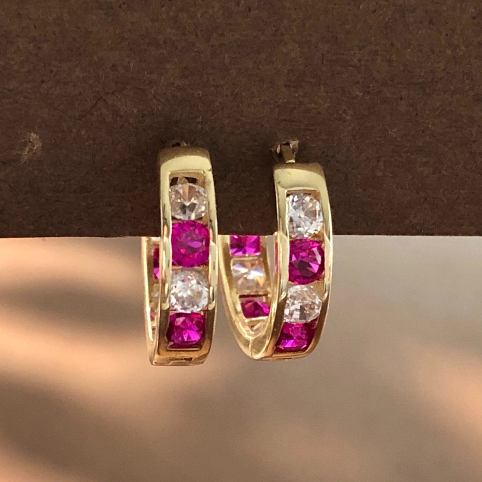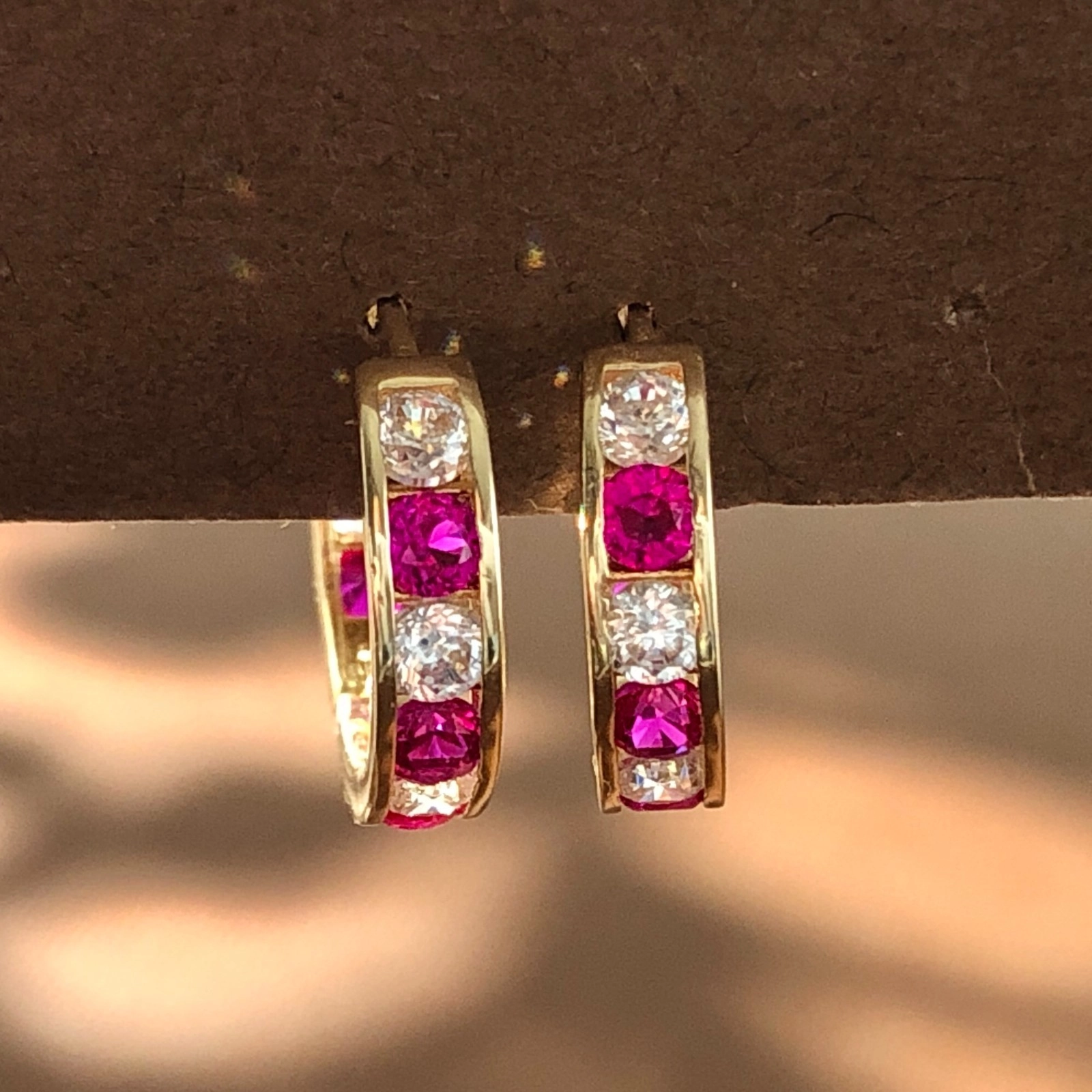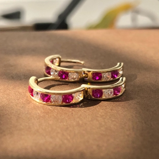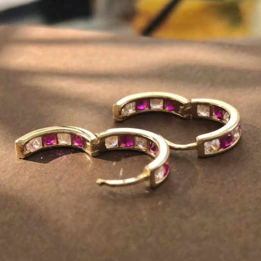 14k Yellow Gold Channel-Set Ruby & CZ Huggie Hoop Earrings, 1.58 Grams, 12mm Earring Height.