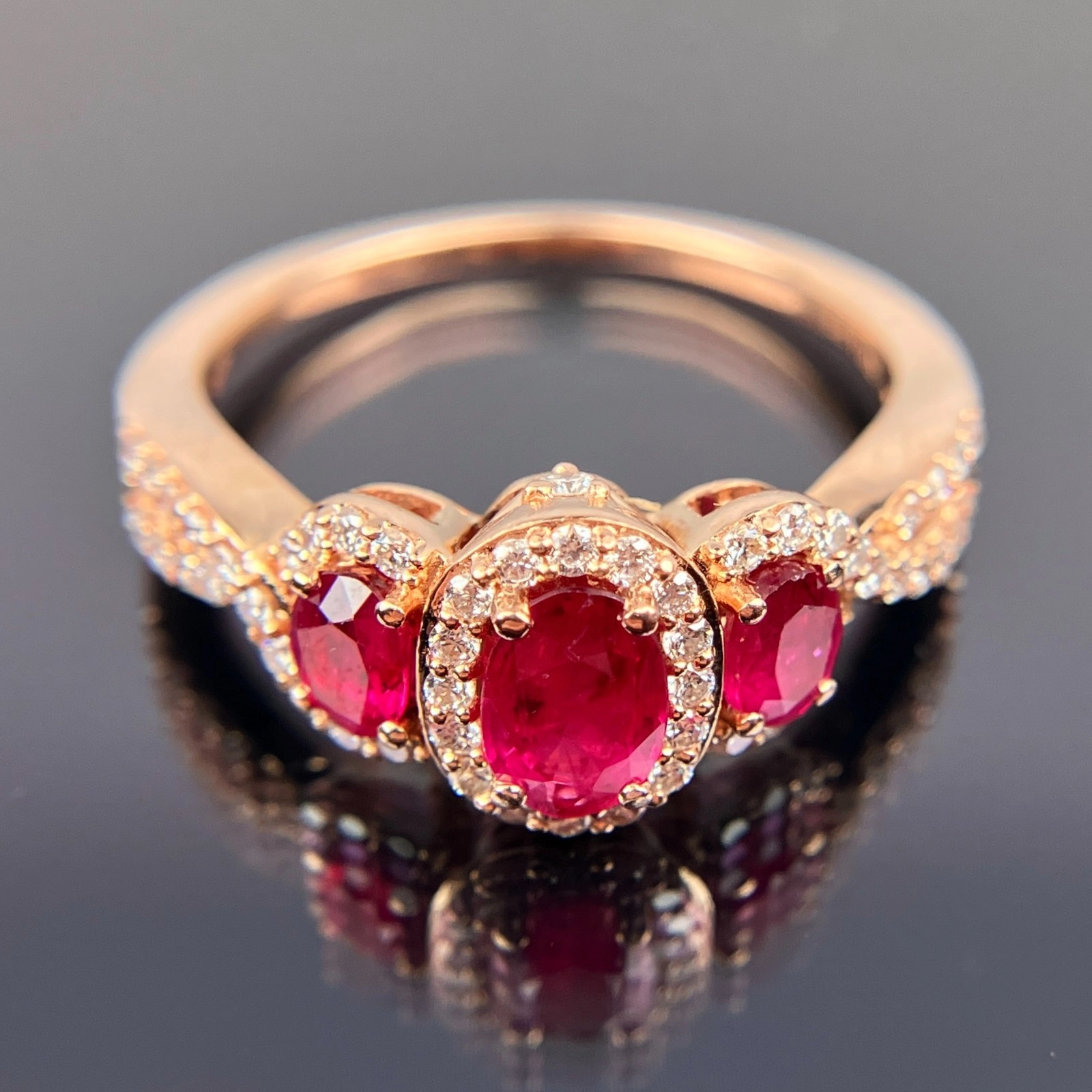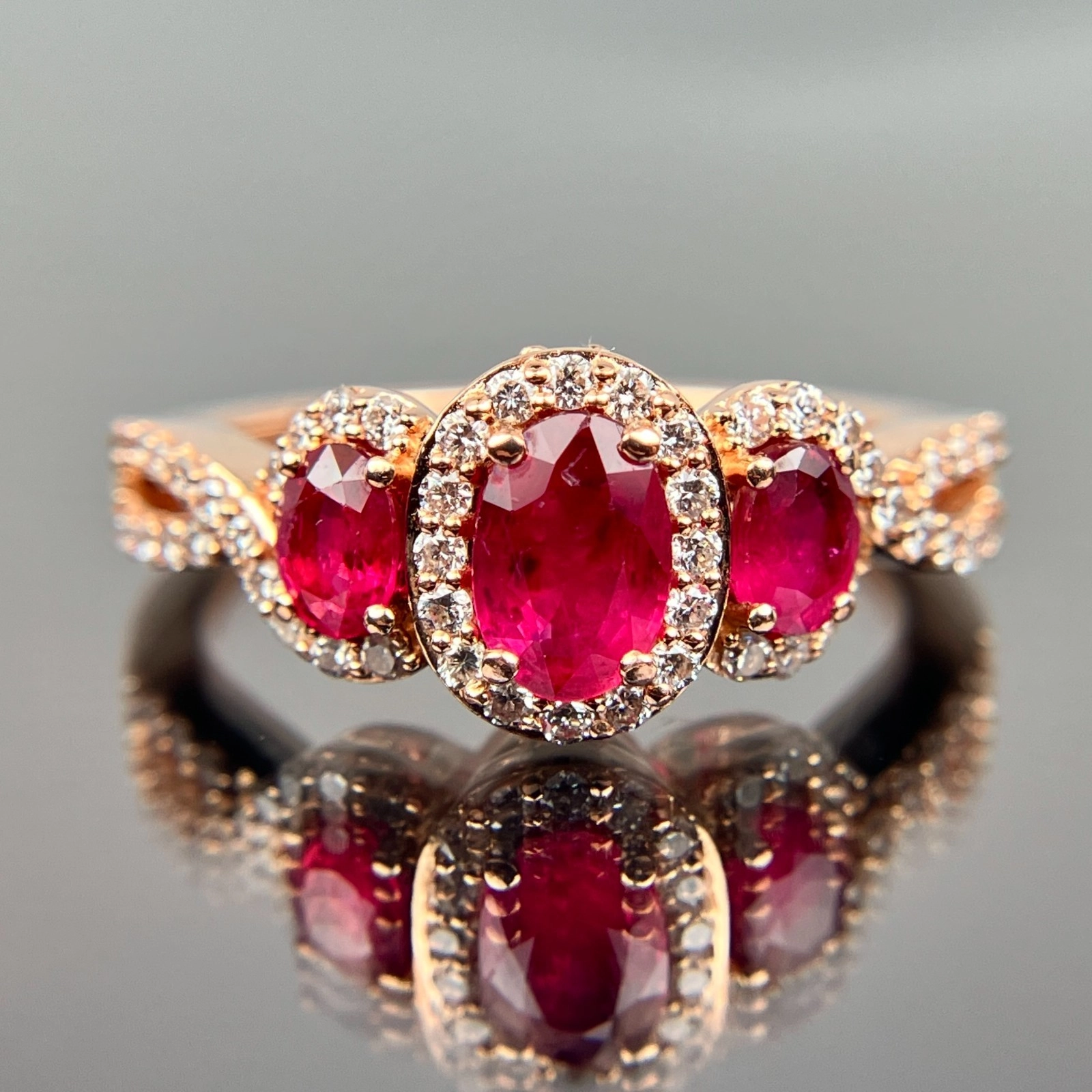 Le Vian 14k Rose Gold Ruby & Diamond Three-Stone Halo Ring Size 6.5, 3.68 Grams.