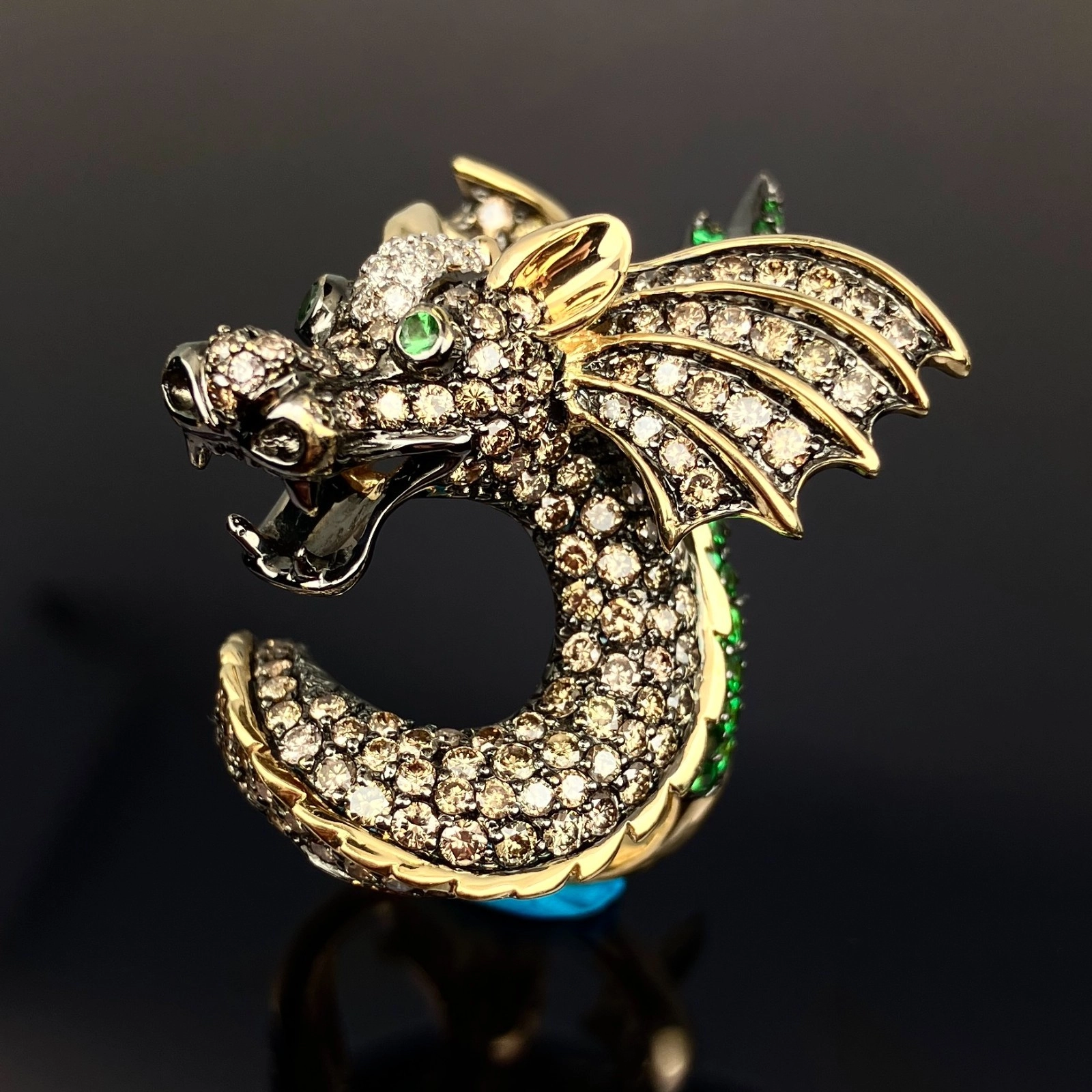 Neda Behnam 18k Yellow Gold Pavé Diamond & Tsavorite Dragon Ring Size 7, 22.67 Grams.